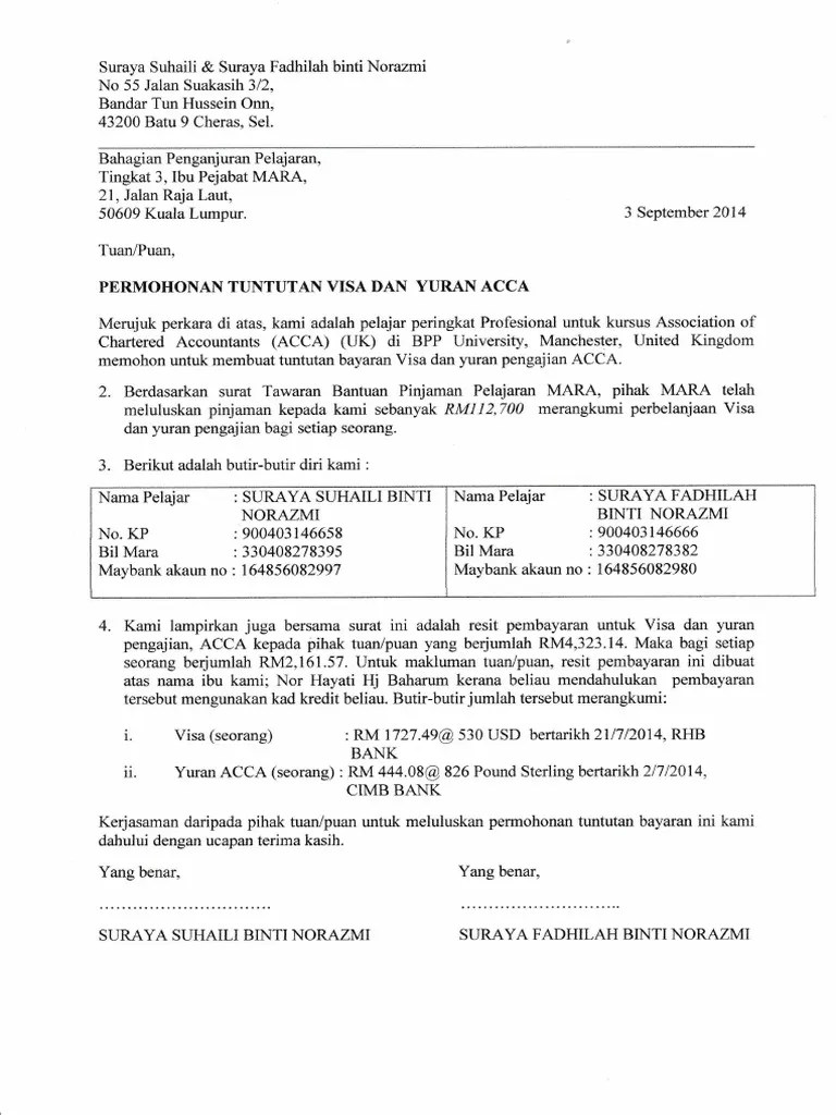1 surat permohonan bayaran balik. Tuan/puan, tuntutan bayaran yuran pengajian pengambilan julai 2015. 1 surat permohonan bayaran balik oleh pemohon. Kerosakan atau tuntutan yang dialami oleh mara disebabkan oleh. Yuran pengajian dan asrama melalui hasil kerajaan/ag. Saya menerima surat makluman senarai hitam (blacklist) daripada mara.